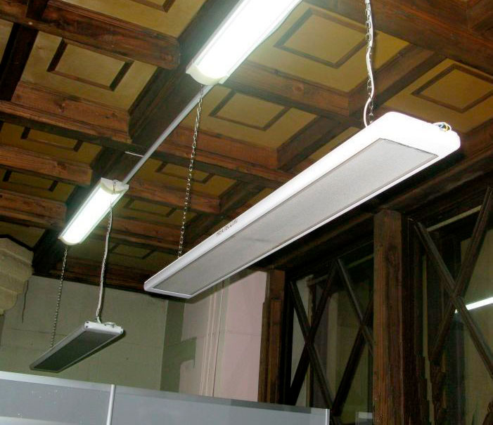 Инфракрасные обогреватели располагаются под потолком и за счет теплового излучения, исходящего от них, подобно солнечным лучам, и имеющим тот же спектр, согревают все предметы, находящиеся под ними.